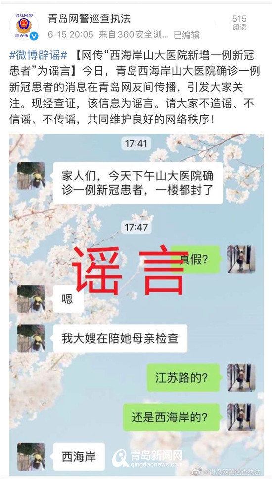 青島新聞網(wǎng)6月15日訊(記者丁淑華)6月15日,一則“青島西海岸山大醫(yī)院確診一例新冠患者”的微信聊天截圖在青島人的朋友圈中傳播,引發(fā)網(wǎng)友關(guān)注。經(jīng)青島網(wǎng)警查證,該信息為謠言,請(qǐng)大家不造謠、不信謠、不傳謠,關(guān)注官方發(fā)布,共同維護(hù)良好的網(wǎng)絡(luò)秩序。