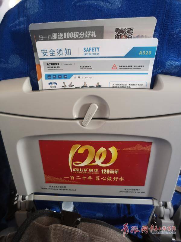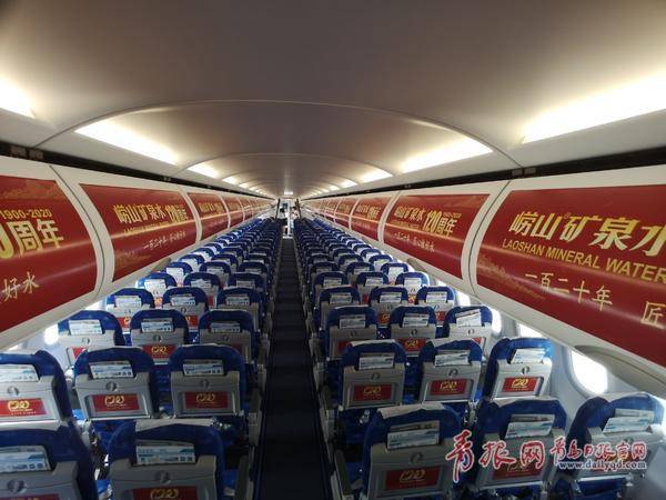 “您好,嶗山礦泉水!”剛一登機,乘務員就向登機人員發(fā)放了一瓶嶗山礦泉水。走進機艙,座位上方的近百個行李架蓋板上,大紅色的嶗山礦泉水120周年主題宣傳海報,很是吸人眼球。坐在座椅上,記者留意到,機艙內174個座椅前方的小桌板上,同樣附有“濃縮版”主題宣傳海報。值得一提的是,乘務人員還貼心為每一位顧客準備了一本由青島飲料集團出品的《水的呵護》宣傳手冊……這架飛機內,從客艙內部裝飾、到機載視頻播放,再到機上飲用水,處處充滿嶗山礦泉水元素。