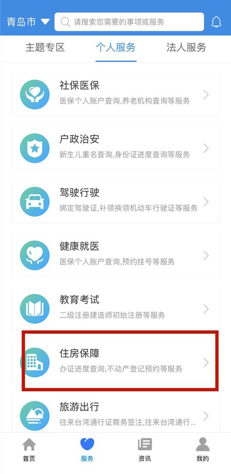 首先,打開“愛山東”APP,地域切換至“青島市”,導(dǎo)航選擇“服務(wù)”,點(diǎn)擊“住房保障業(yè)務(wù)”。