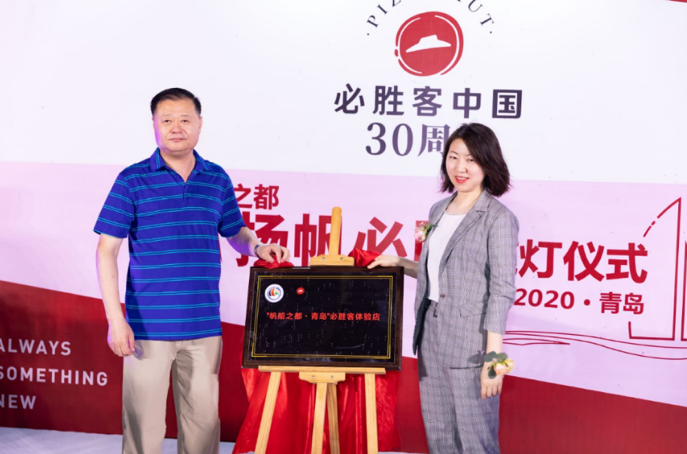 圖為青島市體育局副局級領(lǐng)導(dǎo)劉諭和必勝客中國豫魯市場總經(jīng)理趙麗娜共同為全國首家必勝客“帆船之都揚(yáng)帆必勝”主題餐廳揭牌