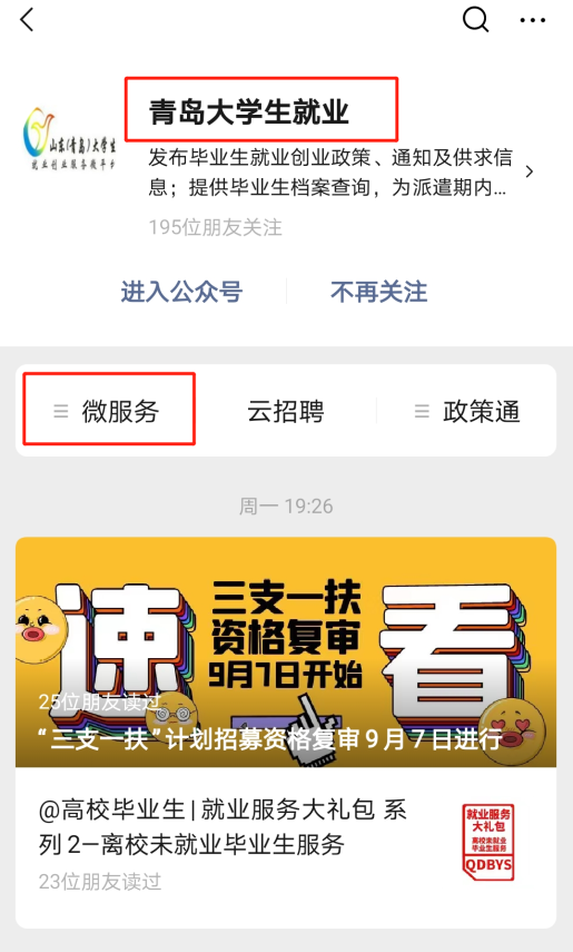 2.可關(guān)注“青島大學(xué)生就業(yè)”微信公眾號,在“微服務(wù)”選擇“檔案查詢”;