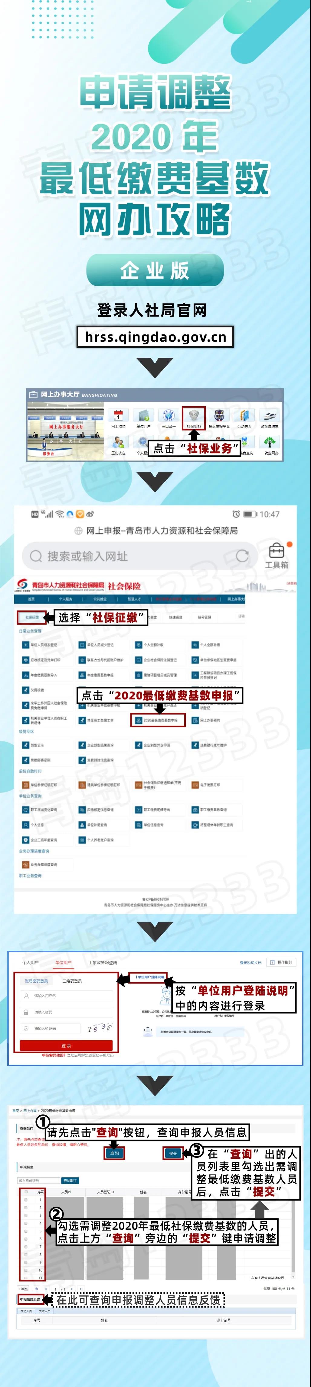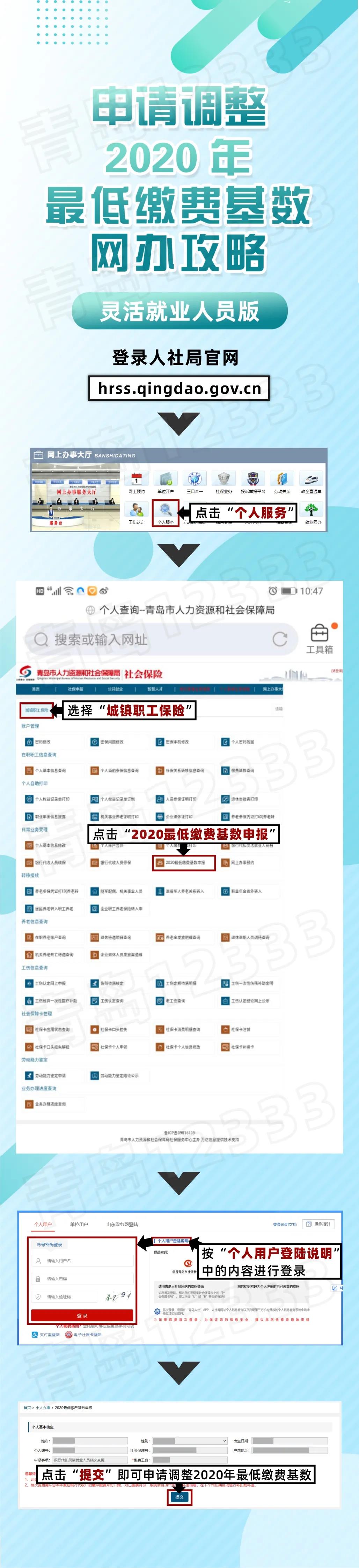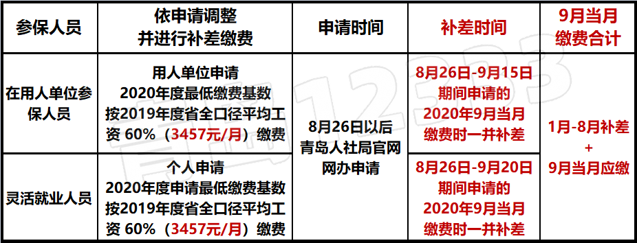 青島新聞網(wǎng)9月17日訊 自8月26日開始,2020年最低社保繳費基數(shù)調(diào)整網(wǎng)辦模塊現(xiàn)在可以申請啦!有調(diào)整需求的參保企業(yè)和靈活就業(yè)人員可登錄青島人社局官網(wǎng)進行調(diào)整申請。在奉上網(wǎng)辦申請攻略之前,讓我們一起來溫故下重點。參保企業(yè)和靈活就業(yè)人員,如現(xiàn)在申請調(diào)整2020年最低繳費基數(shù)為3457元的,將于9月份社保繳費時進行1-8月補差。