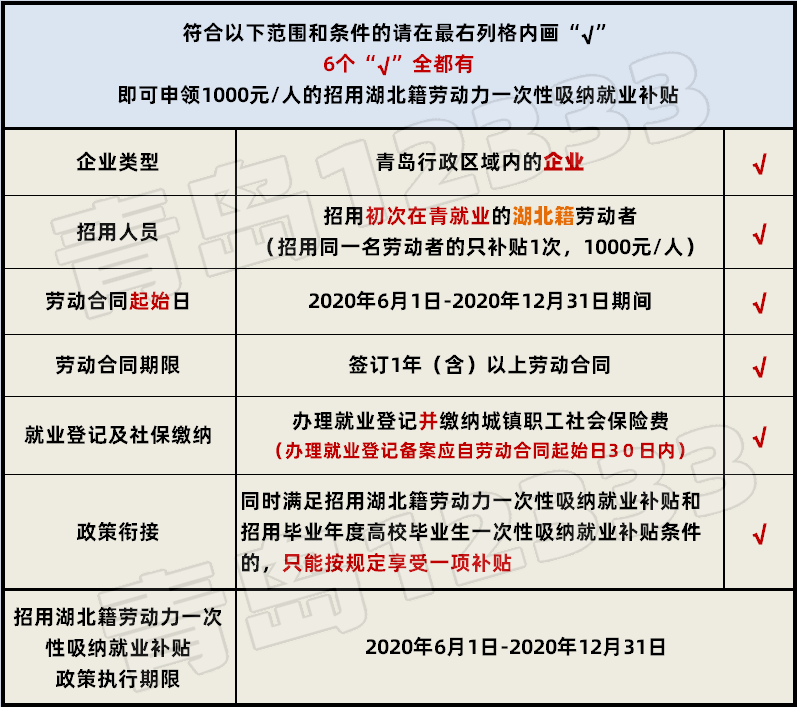 青島新聞網(wǎng)9月17日訊 企業(yè)招用湖北籍勞動(dòng)力,一次性吸納就業(yè)補(bǔ)貼,符合條件者每人可補(bǔ)貼1000元/人,上不封頂。