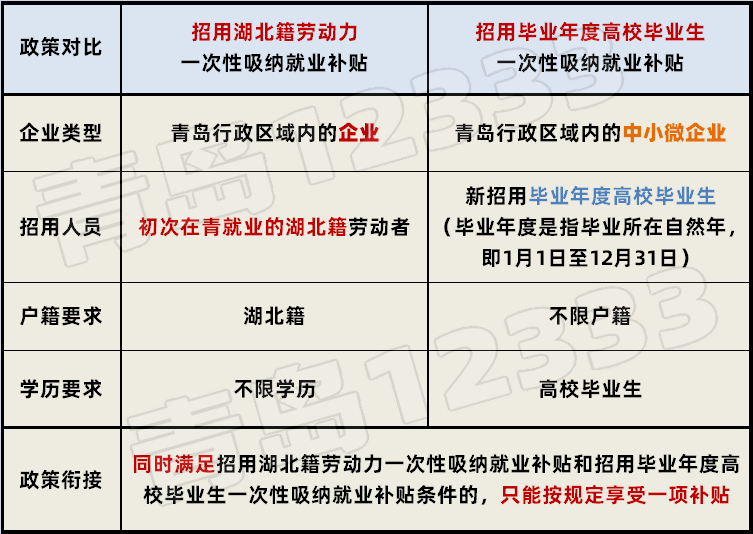 一次性吸納就業(yè)補(bǔ)貼湖北籍勞動(dòng)力和畢業(yè)年度高校畢業(yè)生政策對(duì)比簡(jiǎn)明表: