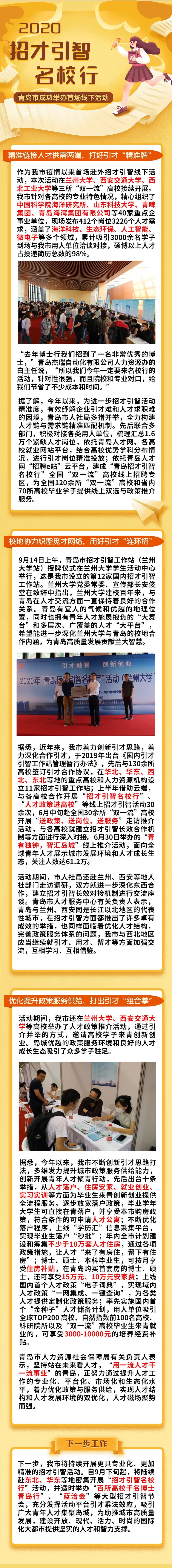 青島新聞網(wǎng)9月24日訊 為深入推進(jìn)“雙招雙引”等15個(gè)攻勢(shì),通過(guò)密集開展招才引智活動(dòng)實(shí)現(xiàn)青年人才集聚,給島城高質(zhì)量發(fā)展注入強(qiáng)大人才動(dòng)能。9月14日-18日,我市在蘭州、西安等地舉辦2020年首次“青島市招才引智名校行”活動(dòng)。