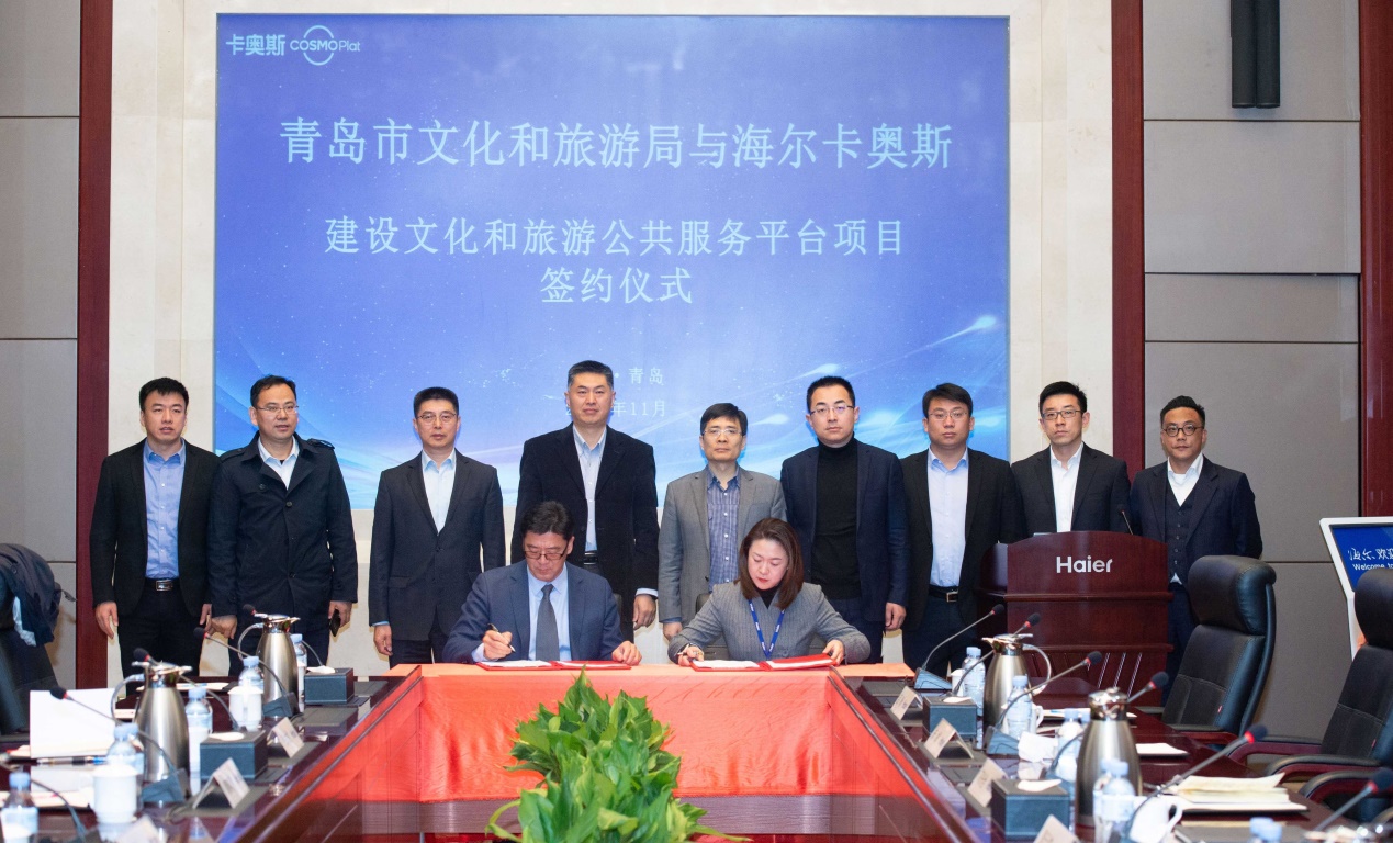 青島市文化和旅游局局長朱鐵一、副局長隋邦儒等政府領(lǐng)導(dǎo),海爾集團(tuán)總裁周云杰以及卡奧斯COSMOPlat相關(guān)負(fù)責(zé)人出席簽約儀式。