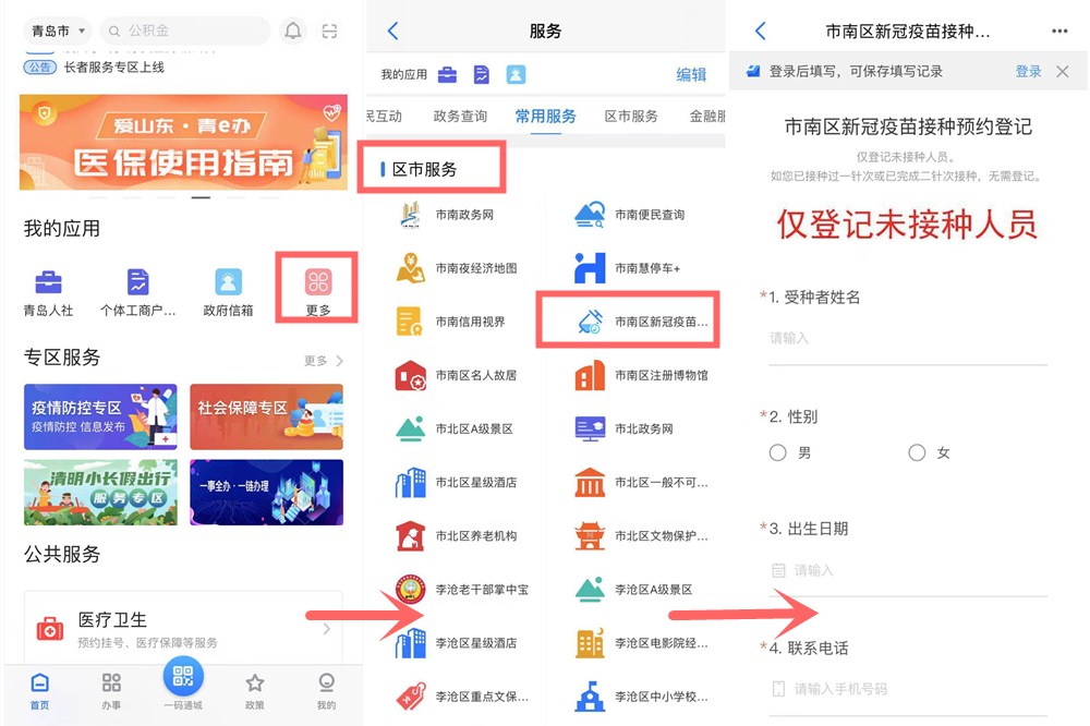 青島新聞網(wǎng)4月9日訊 青島市目前正有序開(kāi)展新冠疫苗接種工作,各區(qū)市線上預(yù)約入口也都已經(jīng)陸續(xù)開(kāi)放。為保證疫苗接種工作順利進(jìn)行,市南區(qū)新冠疫苗接種預(yù)約登記入口已經(jīng)在“愛(ài)山東·青e辦”接入服務(wù)。需要注意的是,此次登記僅針對(duì)未接種人員,如已接種過(guò)一針次或已完成二針次接種,則無(wú)需登記。
