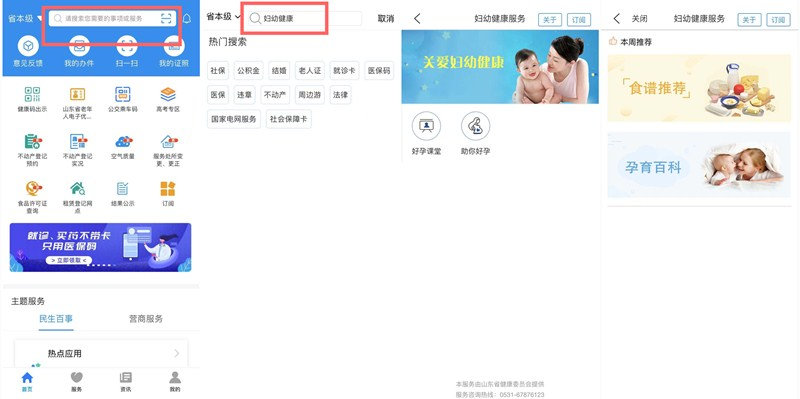 打開“愛山東”APP首頁,在上方搜索欄搜索“婦幼健康”并選擇進入,即可查看。