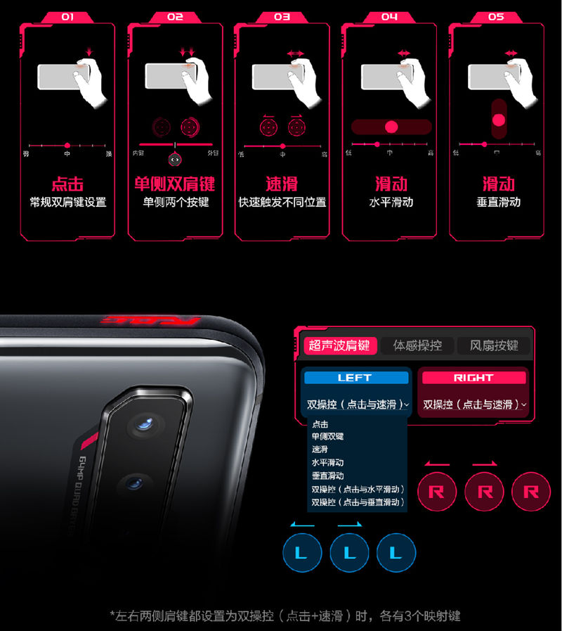 騰訊ROG游戲手機(jī)5s系列AirTrigger超聲波升級(jí)至2×3雙操控模式,單側(cè)肩鍵支持設(shè)置點(diǎn)擊+水平/垂直滑動(dòng),可輕松解鎖食指戰(zhàn)力。如果使用加裝酷冷風(fēng)扇5的騰訊ROG游戲手機(jī)5s,還能進(jìn)一步解鎖雙背鍵體驗(yàn),讓其他手指也能參與到操控當(dāng)中。與騰訊ROG游戲手機(jī)5s不同,騰訊ROG游戲手機(jī)5s Pro無(wú)需加裝,其背面自帶雙背鍵,可以映射更多按鍵,帶來(lái)手柄式的精準(zhǔn)操控。更配置炫彩ROG Vision個(gè)性視窗,可供玩家自由定制彩色圖案,展現(xiàn)個(gè)性的同時(shí),更帶來(lái)更強(qiáng)電競(jìng)氛圍。