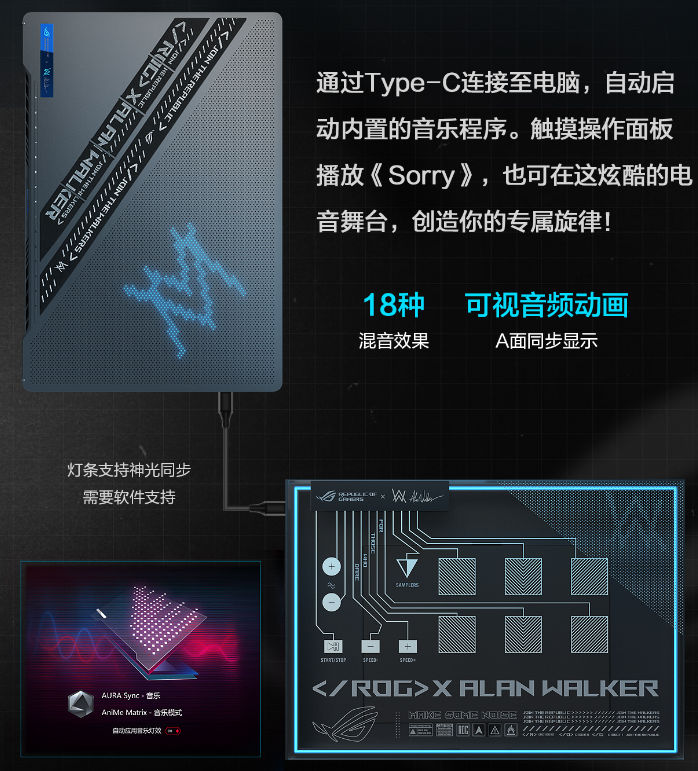 ROG Remix是Alan Walker在整個(gè)設(shè)計(jì)中最喜歡的部分,當(dāng)手指放在電音盒上的那一刻起,便可以感受到令人驚艷的設(shè)計(jì),這是一個(gè)極具創(chuàng)意的配件,只需用包裝里的USB Type-C線將盒子連接到電腦上,它便搖身一變成為電音盒,用戶可以觸發(fā)Alan Walker原創(chuàng)的18種音效,可以選擇彈奏內(nèi)置的Alan Walker歌曲,或者將自己的曲子導(dǎo)入Remix軟件,ROG Remix電音盒還可與AniMe Matrix?光顯矩陣屏聯(lián)動(dòng)。