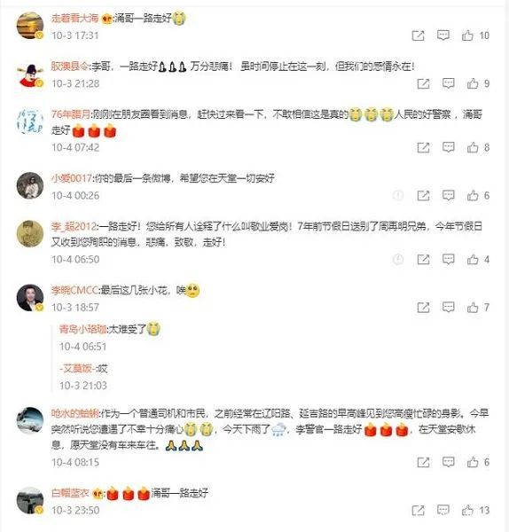 事發(fā)后,李涌的最后一條微博下有近2000條評(píng)論,很多青島本地網(wǎng)友不愿意相信此事,表示“太突然了”“太難受了”。更多網(wǎng)友則表達(dá)了悲痛、哀悼之情。一名網(wǎng)友稱,“一路走好,您給所有人詮釋了什么叫敬業(yè)愛崗”,另一名網(wǎng)友稱,“作為一個(gè)普通司機(jī)和市民,之前經(jīng)常在遼陽路、延吉路的早高峰見到李涌高瘦忙碌的身影,今早突然聽說您遭遇了不幸,非常痛心。”