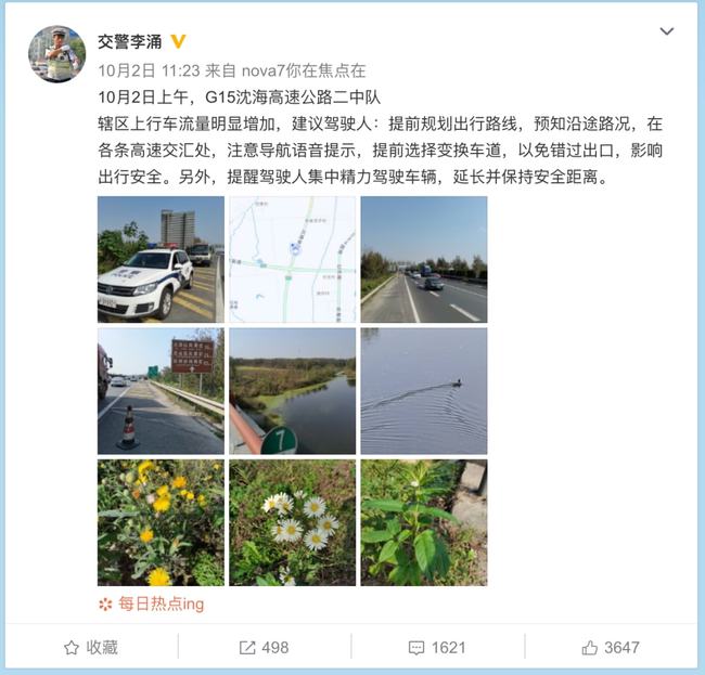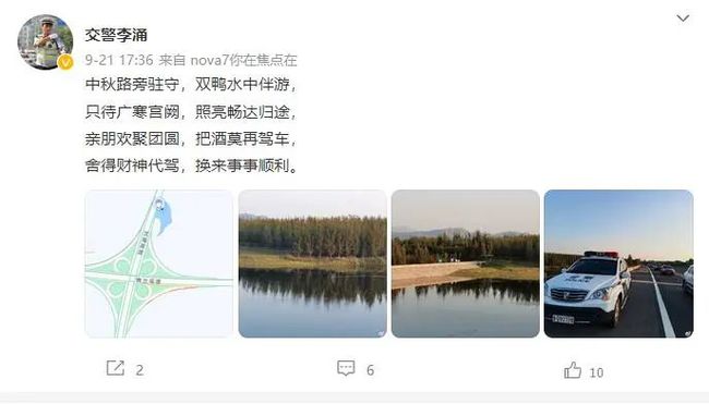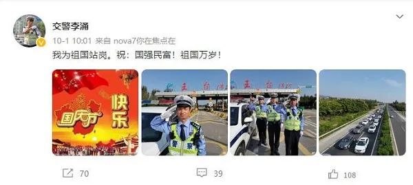 據(jù)多名交警工作人員介紹,李涌此前已經(jīng)調(diào)往高速公路三大隊(duì)。李涌微博也顯示,他經(jīng)常在高速公路巡邏執(zhí)法。他在國慶節(jié)假期堅(jiān)持在崗值班,還特意在10月1日上午10點(diǎn)1分發(fā)微“我為祖國站崗。祝:國強(qiáng)民富!祖國萬歲!”