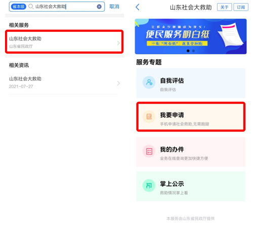1.打開(kāi)“愛(ài)山東”APP、支付寶小程序及微信小程序,首頁(yè)搜索“山東社會(huì)大救助”,點(diǎn)擊進(jìn)入。