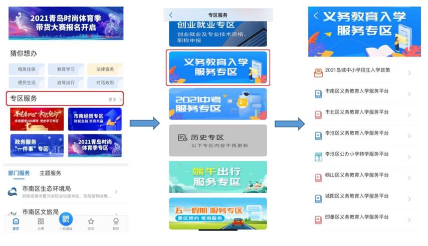 (“愛山東?青e辦”APP內(nèi)點擊專區(qū)服務(wù)“更多”,選擇“義務(wù)教育入學(xué)服務(wù)專區(qū)”,即可選擇辦理。)
