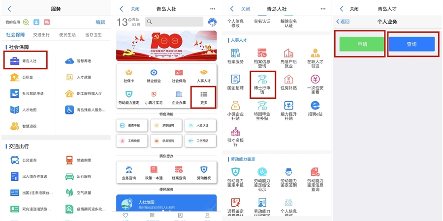 以往,符合條件的博士可登錄“青島人才網(wǎng)”申請。現(xiàn)在,補貼申請又添新渠道。申請人可在“愛山東?青e辦”APP內(nèi)的青島人社應(yīng)用內(nèi)直接申請。首先,在“愛山東?青e辦”APP首頁頂端搜索欄搜索“青島人社”服務(wù)或點擊首頁服務(wù)-社會保障-青島人社;然后,在應(yīng)用詳情頁的“人事人才”欄目下,找到“博士行申請”模塊,進入詳情頁后根據(jù)要求填寫信息后提交申請即可。申請?zhí)峤缓?,如需查看審核結(jié)果,可點擊“查詢”進行查看。