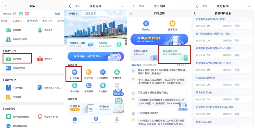 “愛山東·青e辦”內(nèi)的“醫(yī)療保障”應(yīng)用,可掌上查詢最新的國家藥品目錄,且查詢步驟簡單。首先,在“愛山東·青e辦”APP首頁點擊“更多”,進入“服務(wù)”詳情頁找到醫(yī)療衛(wèi)生分類下的“醫(yī)療保障”應(yīng)用;然后,在應(yīng)用詳情頁的“醫(yī)保常用”模塊下找到“門診統(tǒng)籌”點擊進入;最后,在“門診統(tǒng)籌”頁面點擊“藥品材料目錄”即可查詢藥品目錄清單、自付比例、收費等級等藥品報銷信息。