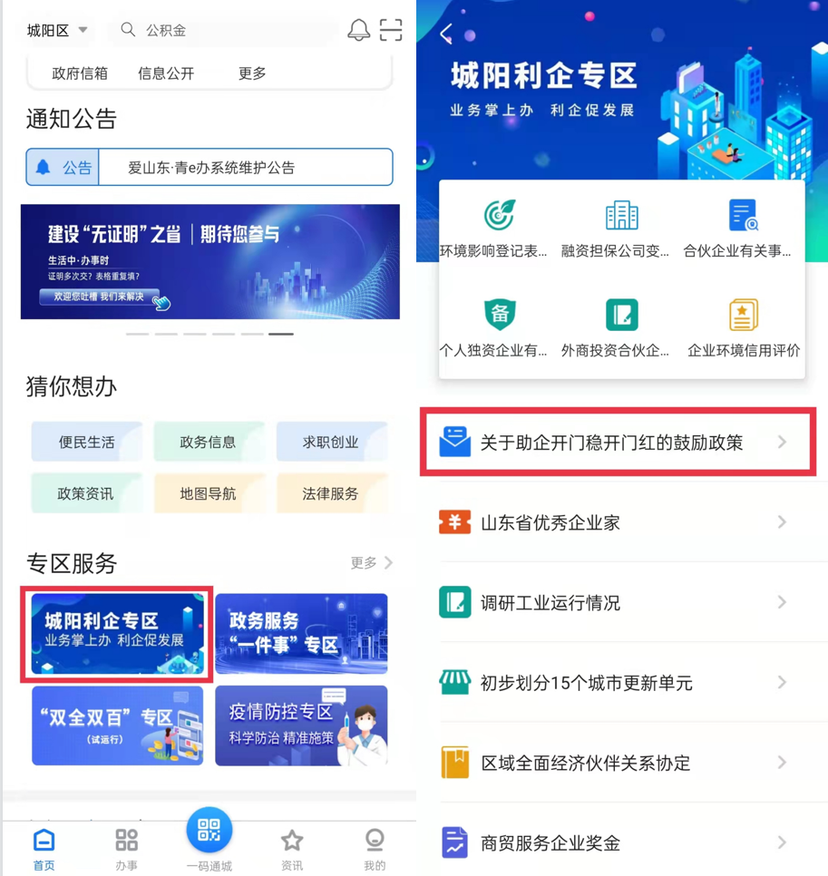 2、首頁(yè)下滑至專區(qū)服務(wù),點(diǎn)擊“城陽(yáng)利企專區(qū)”,即可進(jìn)入。用戶可以在專區(qū)掌上辦理企業(yè)經(jīng)營(yíng)相關(guān)事項(xiàng),并查閱企業(yè)經(jīng)營(yíng)相關(guān)政策資訊等實(shí)用內(nèi)容。