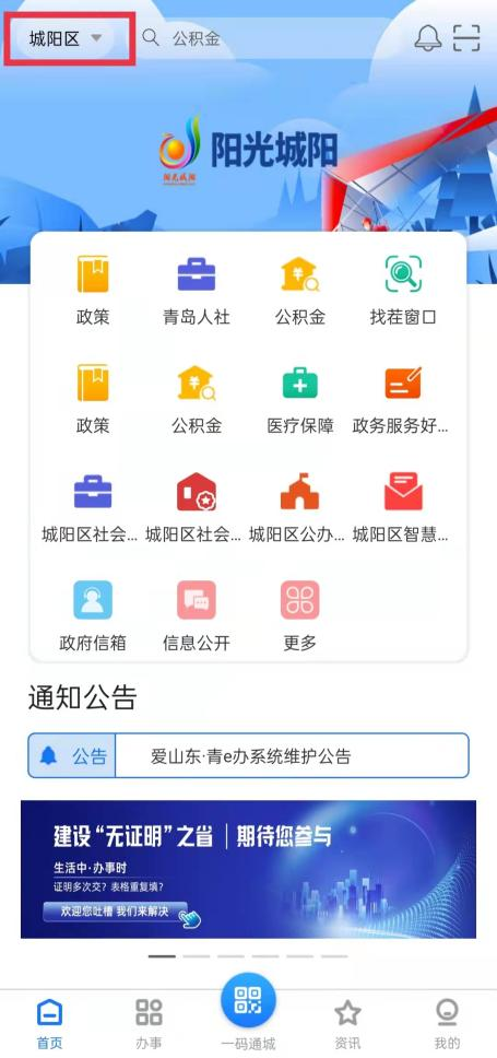 1、打開“愛(ài)山東·青e辦”APP,進(jìn)入首頁(yè),左上角點(diǎn)擊切換至城陽(yáng)分廳;