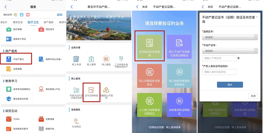 青島新聞網(wǎng)3月2日訊 銀行、開發(fā)商、中介和購房者等機(jī)構(gòu)和個(gè)人,擔(dān)心拿到的不動(dòng)產(chǎn)權(quán)證書和查詢證明的信息真?zhèn)?,但是跑去窗口查詢又很不方便。為滿足查詢申請(qǐng)人在前期了解不動(dòng)產(chǎn)買賣、租賃、抵押等方面情況的需求,方便企業(yè)群眾辦事,進(jìn)一步提高查詢工作質(zhì)效,“愛山東·青e辦”對(duì)接市不動(dòng)產(chǎn)登記中心接入了證書證明核驗(yàn)服務(wù),企業(yè)群眾通過“不動(dòng)產(chǎn)登記”應(yīng)用即可查詢驗(yàn)證。