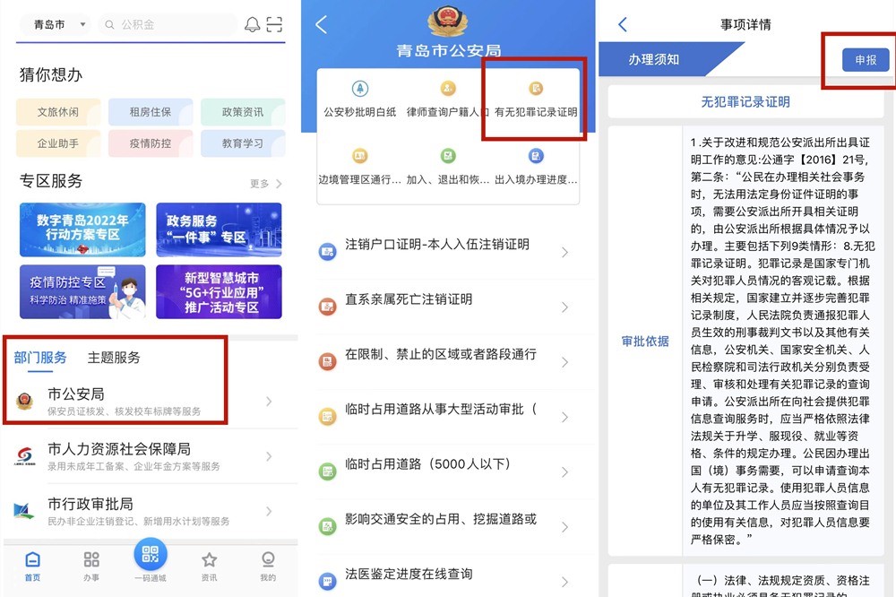 有需要的市民在“愛(ài)山東·青e辦”APP操作三步即可申請(qǐng)辦理。首先,在“愛(ài)山東·青e辦”APP首頁(yè)部門服務(wù)找到市公安局專欄;然后,在市公安局部門服務(wù)詳情頁(yè)找到“有無(wú)犯罪記錄證明”服務(wù)點(diǎn)擊進(jìn)入,進(jìn)行刷臉認(rèn)證。最后,在辦理詳情頁(yè)點(diǎn)擊“申報(bào)”并根據(jù)要求和提示填寫信息完整驗(yàn)證后即可辦理,不必再頻繁提交本人各類相關(guān)證明材料。本市群眾在手機(jī)上提交申請(qǐng)后,系統(tǒng)后臺(tái)會(huì)自動(dòng)進(jìn)行數(shù)據(jù)分析和信息核查,查詢結(jié)果自動(dòng)反饋給申請(qǐng)人。只要申請(qǐng)人沒(méi)有任何疑似違法犯罪信息,系統(tǒng)就會(huì)自動(dòng)出具加蓋公安機(jī)關(guān)電子印章的無(wú)犯罪記錄證明,并將電子版推送到申請(qǐng)人手機(jī)上,申請(qǐng)人可將該電子版證明文件自行進(jìn)行打印。