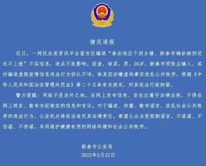 經(jīng)查,徐某,男,26歲,新泰市西張莊鎮(zhèn)人,其對編造虛假疫情信息違法行為供認不諱。