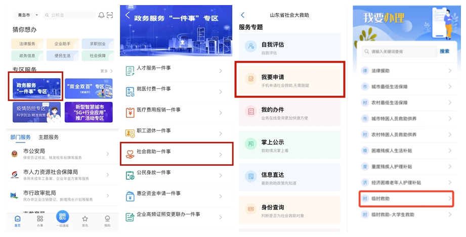 疫情期間倡導(dǎo)不見面審批,因意外事件導(dǎo)致基本生活暫時出現(xiàn)嚴(yán)重困難的群眾可通過“愛山東·青e辦”APP中的“政務(wù)服務(wù)一件事”專區(qū)中的“社會救助一件事”在線辦理臨時救助。