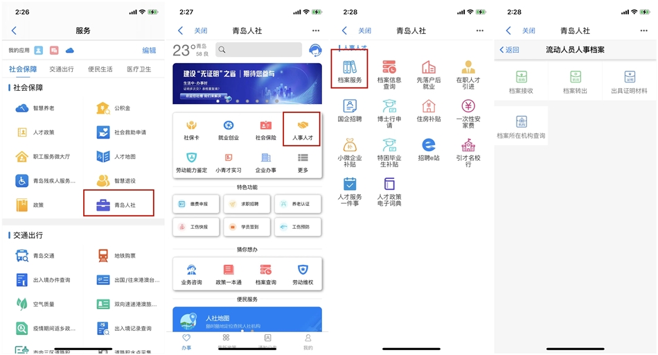 除市人社局官網(wǎng)外,為方便市民辦事,“愛山東·青e辦”也提供了檔案業(yè)務(wù)掌上辦理渠道。有需要的市民只需三步即可完成掌上辦理。首先,在“愛山東·青e辦”APP“服務(wù)”詳情頁找到社會(huì)保障分類下的“青島人社”應(yīng)用;然后,在應(yīng)用詳情頁的“人事人才”欄目下,找到“檔案服務(wù)”模塊,點(diǎn)擊進(jìn)入詳情頁后根據(jù)實(shí)際需求可選擇辦理檔案轉(zhuǎn)出、檔案接收、出具證明材料、檔案所在機(jī)構(gòu)查詢等業(yè)務(wù)。根據(jù)每項(xiàng)業(yè)務(wù)頁面要求填寫、提交相關(guān)材料,點(diǎn)擊提交,閱讀注意事項(xiàng)后,點(diǎn)擊確認(rèn)即可完成在線申請。