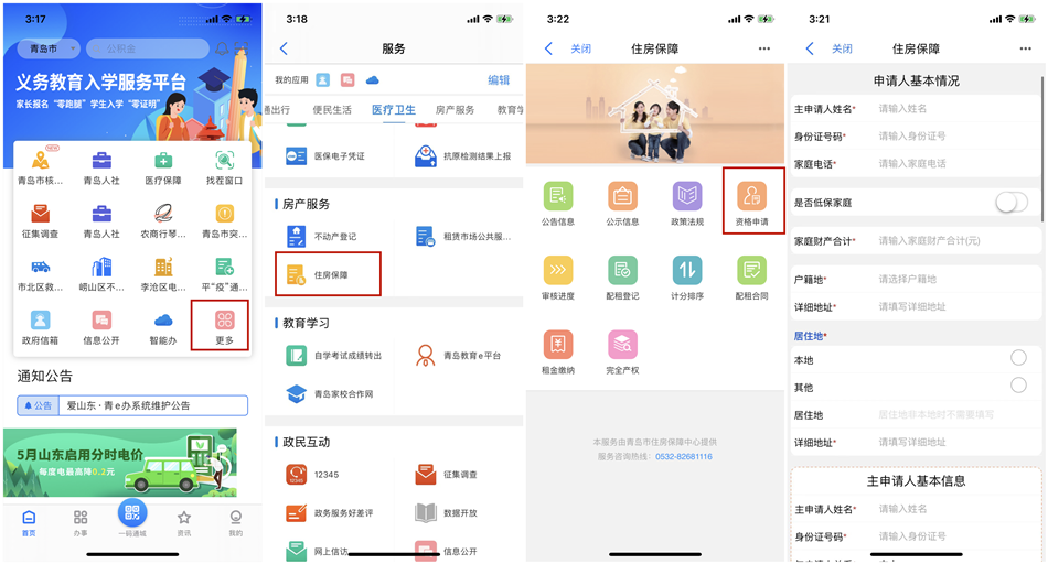 申請步驟如下。在“愛山東·青e辦”APP首頁點擊“更多”,在“房產(chǎn)服務(wù)”分類下,找到“住房保障”服務(wù),點擊進(jìn)入。點擊進(jìn)入后,在業(yè)務(wù)辦理頁面選擇“資格申請”點擊進(jìn)入,在申請人基本情況頁面根據(jù)真實情況填寫相關(guān)信息并提交。申請?zhí)峤缓?如需查看審核結(jié)果,可點擊“審核進(jìn)度”進(jìn)行查看。除住房保障資格申請服務(wù)外,還可查看公示公告信息、計分排序、配租合同及配租登記、租金繳納等操作。