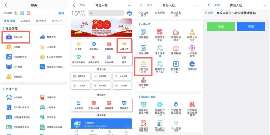 高校畢業(yè)生小微企業(yè)就業(yè)補貼標準每人每月400元,自首次申領(lǐng)補貼月份起36個月內(nèi)可享受補貼。以往符合條件的畢業(yè)生可登錄“青島人才網(wǎng)”申請。現(xiàn)在,補貼申請又添新渠道。申請人可在“愛山東·青e辦”APP內(nèi)的青島人社應(yīng)用內(nèi)直接申請。首先,在“愛山東·青e辦”APP“服務(wù)”詳情頁找到社會保障分類下的“青島人社”應(yīng)用;然后,在應(yīng)用詳情頁的“人事人才”欄目下,找到“小微企業(yè)補貼”模塊,進入詳情頁后根據(jù)要求填寫信息后提交補貼申請。申請完成后,還可點擊查詢按鈕,進行已申請的補貼項目信息查詢。