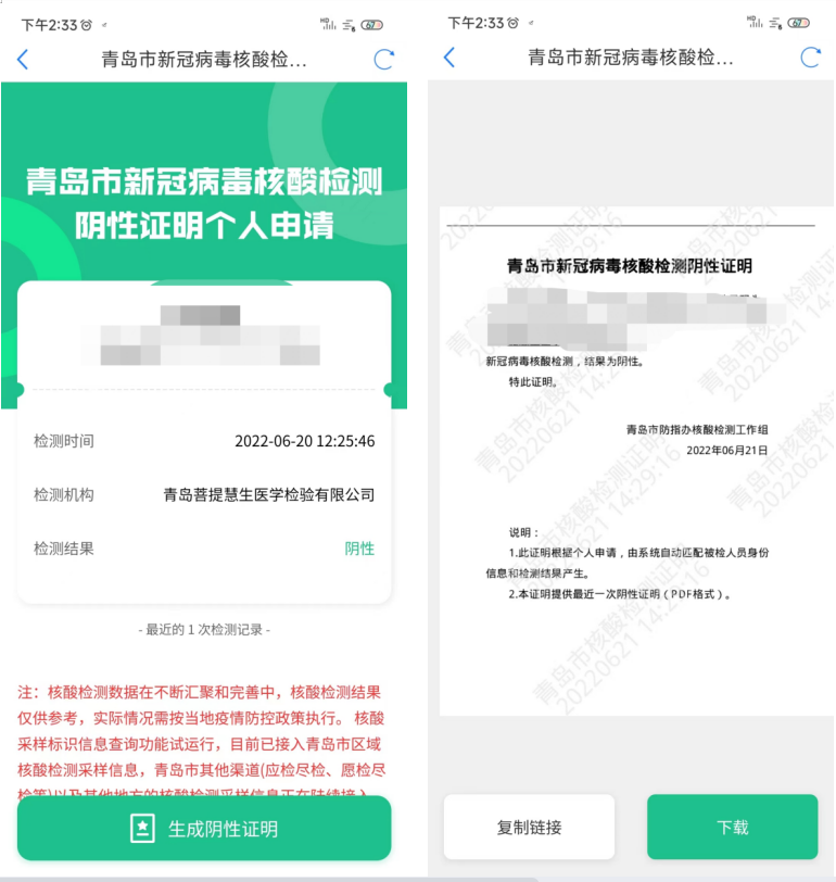 青島新聞網(wǎng)6月24日訊 記者從市大數(shù)據(jù)局了解到,青島市新冠病毒核酸檢測(cè)陰性證明個(gè)人申請(qǐng)服務(wù)正式上線運(yùn)行,市民通過“愛山東”APP、“愛山東·青e辦”APP登錄后,即可掌上查看、下載核酸檢測(cè)陰性證明。