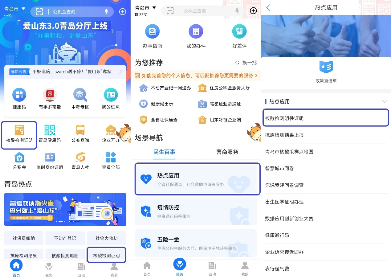 1、打開“愛山東”APP,在首頁直接進(jìn)入,或通過“服務(wù)-民生百事-熱點(diǎn)應(yīng)用”進(jìn)入“核酸檢測(cè)陰性證明”應(yīng)用。