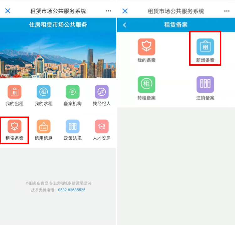 2、進(jìn)入“住房租賃市場公共服務(wù)”應(yīng)用,點(diǎn)擊“租賃備案”——“新增備案”,根據(jù)頁面指引填寫信息,即可完成租賃備案。