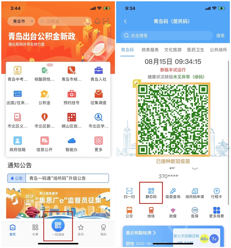 市民可在“愛山東·青e辦”APP首頁點擊底部“一碼通城”,線上領取使用“青島碼”。老年人、中小學生、嬰幼兒等不便使用智能手機的特殊群體,可以直接打印使用“青島碼靜態(tài)碼”,通過展示實體二維碼的方式進行身份認證和場所登記,滿足老人和孩子的出行、辦事需求。