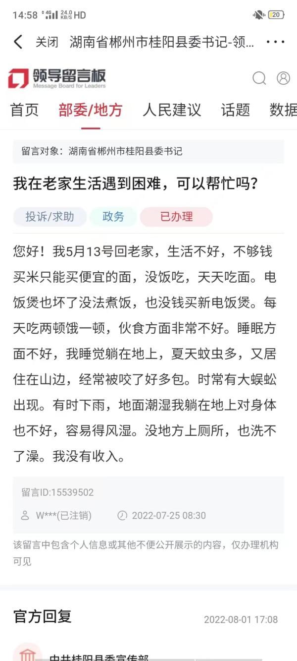 今年7月25日,陳橙在某平臺(tái)網(wǎng)站的領(lǐng)導(dǎo)留言板寫下:“我5月13日回老家,生活不好,沒飯吃,天天吃面……我睡覺躺在地上,沒地方上廁所,我沒有收入……”他標(biāo)注留言對(duì)象是湖南省郴州市桂陽縣委書記。