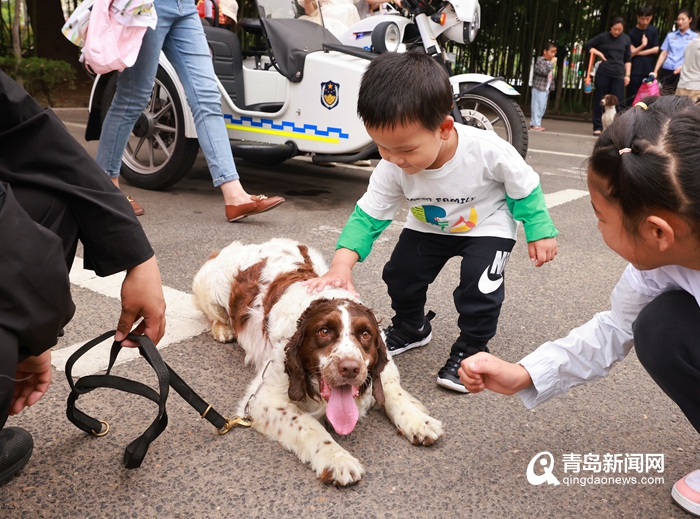 為了增強(qiáng)互動(dòng)性和趣味性,分局刑偵大隊(duì)的警犬們也來到了活動(dòng)現(xiàn)場(chǎng)。訓(xùn)練有素的警犬準(zhǔn)確執(zhí)行車輛搜索、拋物銜取、撲咬等各項(xiàng)指令,孩子們爭(zhēng)先恐后的搶答各種問題,加油聲、吶喊聲此起彼伏。