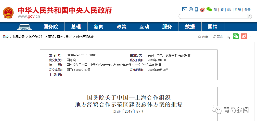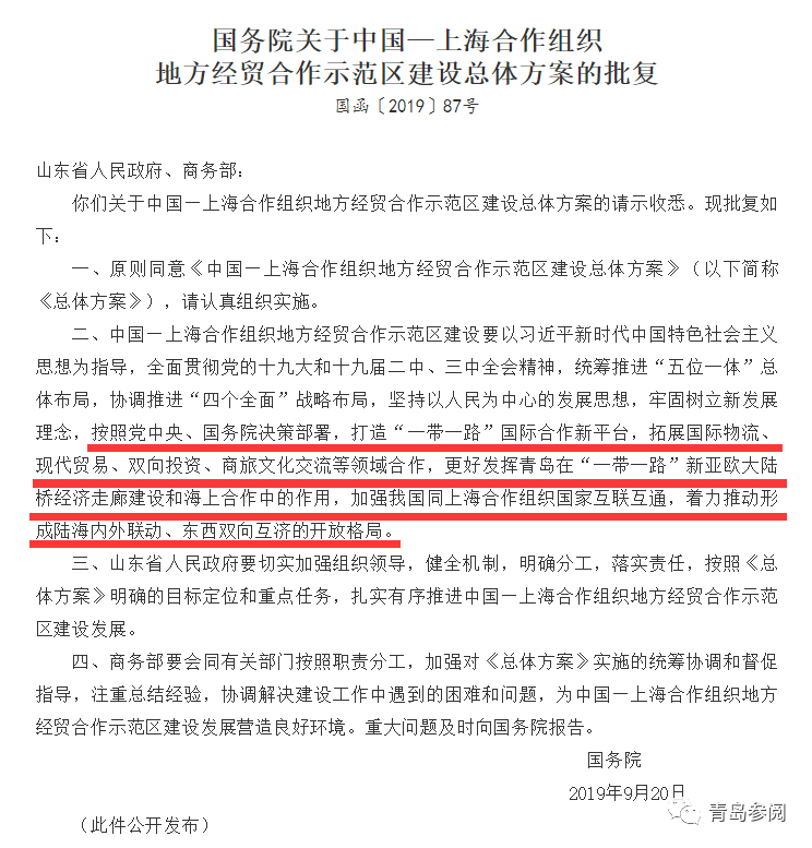 2019年10月8日,據(jù)中國(guó)政府網(wǎng)消息,國(guó)務(wù)院正式批復(fù)了關(guān)于中國(guó)—上海合作組織地方經(jīng)貿(mào)合作示范區(qū)建設(shè)總體方案,標(biāo)志著位于青島上合示范區(qū)建設(shè)獲得了來(lái)自中央的支持與肯定。