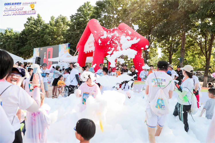 伴隨著動感的音樂,水槍大戰(zhàn)+電音派對同時開啟,DJ與舞者帶領(lǐng)全場一起嗨翻這一刻,大家把彩色玉米粉同時拋向空中,彩色的粉末隨風飛舞,吶喊與歡呼交織,色彩與青春碰撞,匯聚成一道道絢爛無比的彩虹人潮。參賽者還不忘拿起水槍互相噴射,有人更是被眾多人“圍攻”,頭發(fā)上、臉上都是不同的顏色,每個臉龐都像調(diào)色盤一樣繽紛生動。更有巨型“泡泡槍”將超多白色泡沫噴向空中,瞬間把狂歡氣氛推向高潮。大人與小孩都在潔白細膩的泡沫里穿梭翻滾,歡樂的笑臉與笑聲連成片,千余人一起洗泡泡浴,這樣的體驗可是非常難得的,相信這快樂又神奇的時刻將深深印在每個人的腦海里。