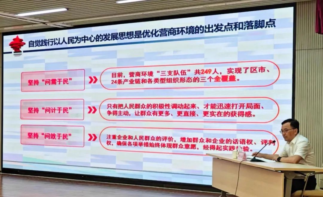 趙發(fā)海同志結(jié)合學(xué)習(xí)心得和前期調(diào)研情況,重點(diǎn)從三個(gè)方面展開(kāi)詳細(xì)的闡述,為全局黨員、干部深入開(kāi)展學(xué)習(xí)貫徹習(xí)近平新時(shí)代中國(guó)特色社會(huì)主義思想主題教育提供了具體行動(dòng)指導(dǎo)。一是在學(xué)深悟透習(xí)近平總書(shū)記關(guān)于優(yōu)化營(yíng)商環(huán)境重要論述上下功夫。堅(jiān)持黨的領(lǐng)導(dǎo)是優(yōu)化營(yíng)商環(huán)境的根本保證,自覺(jué)踐行以人民為中心的發(fā)展思想是優(yōu)化營(yíng)商環(huán)境的出發(fā)點(diǎn)和落腳點(diǎn),處理好政府與市場(chǎng)關(guān)系是優(yōu)化營(yíng)商環(huán)境的關(guān)鍵所在,深化改革創(chuàng)新是優(yōu)化營(yíng)商環(huán)境的源頭活水。二是在認(rèn)清優(yōu)化營(yíng)商環(huán)境面臨的新形勢(shì)新任務(wù)上出實(shí)招。要充分認(rèn)識(shí)國(guó)內(nèi)外復(fù)雜形勢(shì)給優(yōu)化營(yíng)商環(huán)境帶來(lái)的巨大壓力,深入挖掘和激發(fā)新時(shí)代優(yōu)化營(yíng)商環(huán)境所蘊(yùn)藏的無(wú)窮潛力,在新征程上立足本職,實(shí)現(xiàn)優(yōu)化營(yíng)商環(huán)境新突破。三是在立足審批服務(wù)實(shí)踐打造一流營(yíng)商環(huán)境上求實(shí)效。要堅(jiān)持以干成事論英雄、以解決實(shí)際問(wèn)題論能力,以高質(zhì)量發(fā)展項(xiàng)目論業(yè)績(jī),把抓工作落實(shí)當(dāng)作全局工作的生命線,錘煉一流作風(fēng)、鍛造一流隊(duì)伍、鑄就一流事業(yè),重點(diǎn)開(kāi)展好七項(xiàng)行動(dòng):黨建品牌擦亮行動(dòng)、作風(fēng)能力提升行動(dòng)、營(yíng)商環(huán)境攻堅(jiān)行動(dòng)、政務(wù)服務(wù)增值行動(dòng)、數(shù)字賦能深化行動(dòng)、意見(jiàn)建議清零行動(dòng)、自我革新提高行動(dòng)。