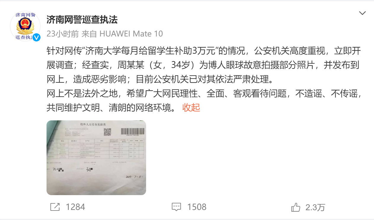 據(jù)@濟南網(wǎng)警巡查執(zhí)法:針對網(wǎng)傳“濟南大學(xué)每月給留學(xué)生補助3萬元”的情況,公安機關(guān)高度重視,立即開展調(diào)查;經(jīng)查實,周某某(女,34歲)為博人眼球故意拍攝部分照片,并發(fā)布到網(wǎng)上,造成惡劣影響;目前公安機關(guān)已對其依法嚴肅處理。