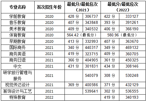 12個(gè)往年招生志愿(排名分位次先后):中文、學(xué)前教育(師范類)、特殊教育(師范類)、商務(wù)英語(yǔ)、早期教育、美術(shù)教育(師范類)、音樂(lè)教育(師范類)、視覺(jué)傳達(dá)設(shè)計(jì)、商務(wù)日語(yǔ)、國(guó)際商務(wù)、研學(xué)旅行管理與服務(wù)、首飾設(shè)計(jì)與工藝。