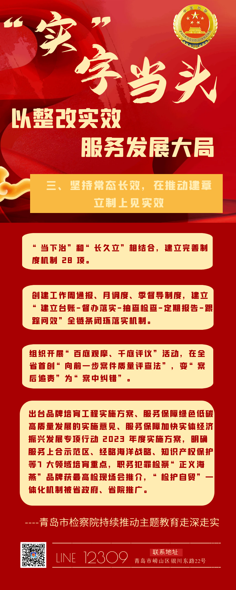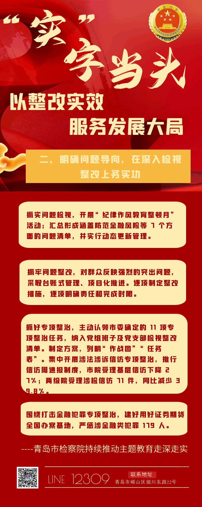 主題教育開展以來,青島市檢察院按照習近平總書記“把問題整改貫穿主題教育始終,讓人民群眾切實感受到解決問題的實際成效”的指示要求,全面貫徹落實中央主題教育整改整治工作推進會精神,以整改整治解難題、促發(fā)展,取得明顯成效。