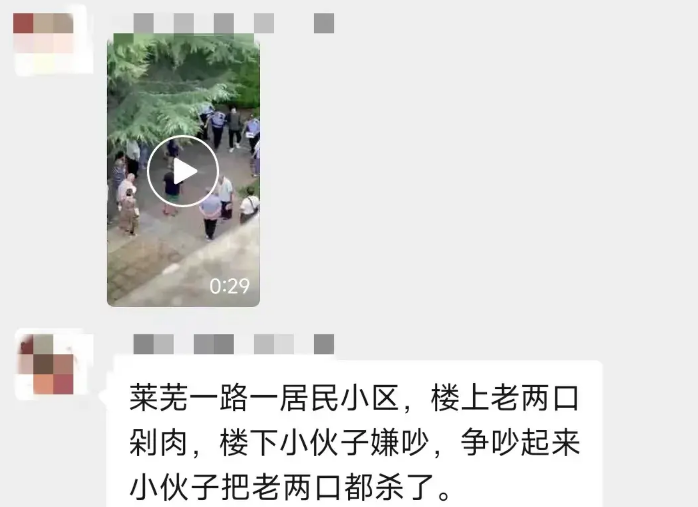 8月7日下午,青島地區(qū)部分微信群中出現(xiàn)一則搭配“萊蕪一路一居民小區(qū),樓上老兩口剁肉,樓下小伙子嫌吵,爭吵起來小伙子把老兩口都殺了。”字樣的視頻內(nèi)容,引發(fā)社會關(guān)注。