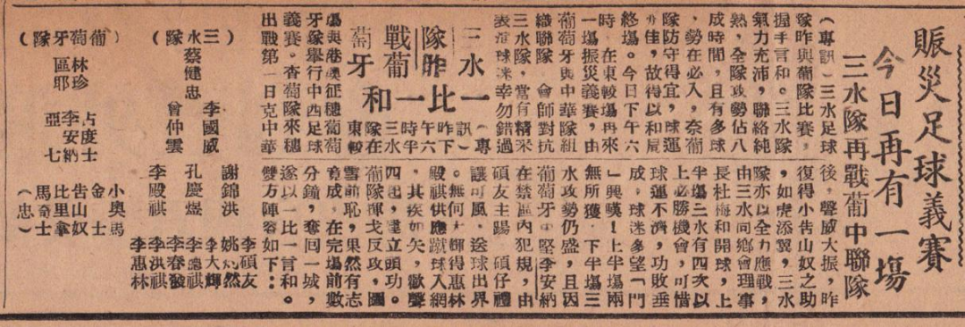 據(jù)資料記載,早在1931年,足球項目就出現(xiàn)在當(dāng)時的第二屆三水縣運動會上。隨后,三水在學(xué)校開展足球運動教育。1949年,三水同鄉(xiāng)會在廣州舉辦慈善足球賽為水災(zāi)災(zāi)民籌款,邀請了葡萄牙的足球隊與三水的足球隊同場競技,并打成1:1的成績。