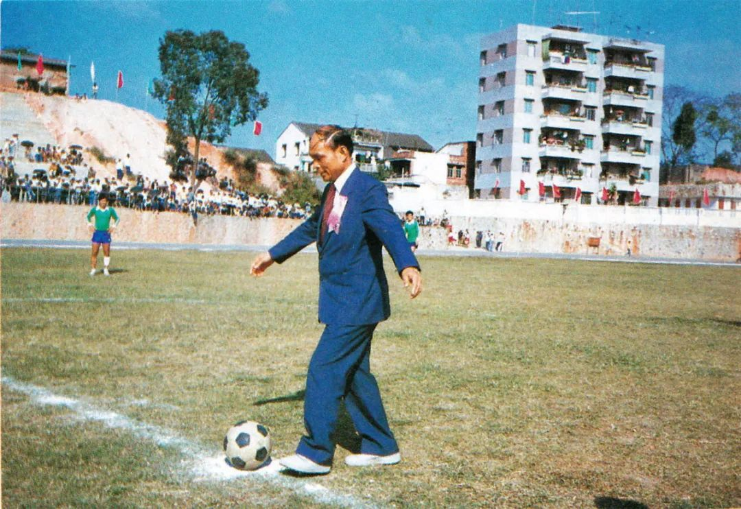 1984年三水西南人民體育場落成剪彩,時任亞洲足球協(xié)會會長霍英東為剪彩后舉行的足球賽開球(1984年拍攝)。麥國培供圖