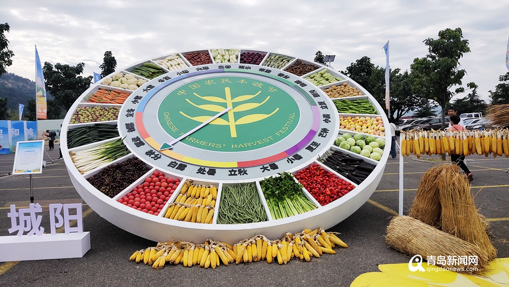 主會場門口,有巨大的“二十四節(jié)氣”實物裝置,每個節(jié)氣的格子里放著四時蔬果,指針指向“秋分”,吸引眾多市民游客興致盎然打卡留念。
