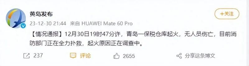 山東青島保稅區(qū)一倉庫突發(fā)大火