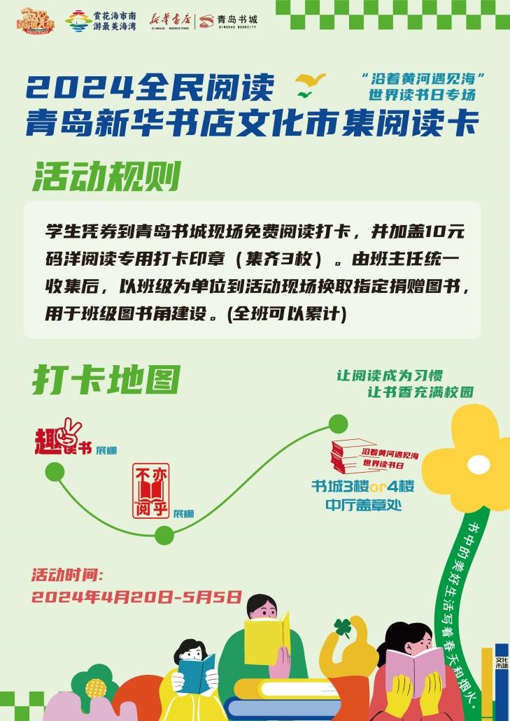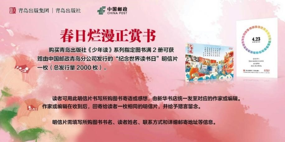 活動內(nèi)容:購買指定圖書滿2冊可獲贈由中國郵政青島分公司發(fā)行的蓋有“世界讀書日”紀(jì)念印章的明信片一枚。