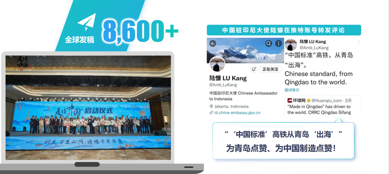 2023年5月,青島新聞網(wǎng)承辦了“走讀中國(guó)”中外網(wǎng)絡(luò)媒體交流活動(dòng)啟動(dòng)儀式,并負(fù)責(zé)首站行程。來自18個(gè)國(guó)家的近30名海外媒體記者組成采訪團(tuán),走進(jìn)青島啤酒博物館、中車股份、海爾集團(tuán)、東方影都等實(shí)地考察,親身體驗(yàn)和記錄中國(guó)文化與歷史、科技的進(jìn)步與社會(huì)的發(fā)展。青島新聞網(wǎng)對(duì)活動(dòng)進(jìn)行海內(nèi)外全媒體宣傳推廣。活動(dòng)在全球平臺(tái)總宣發(fā)新聞8600條,總曝光達(dá)1.5億+,在海內(nèi)外引起強(qiáng)烈反響,外籍記者、網(wǎng)紅在海外平臺(tái)積極推廣,向世界推介青島。同時(shí),活動(dòng)還獲得了外交部及中國(guó)駐印尼大使點(diǎn)贊轉(zhuǎn)發(fā),得到高度認(rèn)可,向世界展現(xiàn)了立體、全面的青島新形象。