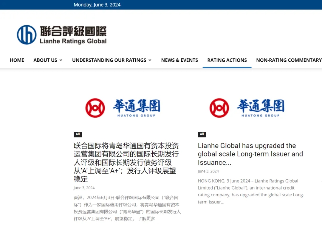 6月3日,聯(lián)合評級國際有限公司(以下簡稱“聯(lián)合國際”)正式宣布,確認(rèn)將青島華通國有資本投資運(yùn)營集團(tuán)有限公司(以下簡稱“華通集團(tuán)”)的國際長期發(fā)行人評級由“A”上調(diào)至“A+”、展望“穩(wěn)定”。這是聯(lián)合國際目前在山東省內(nèi)授予企業(yè)的最高等次評級結(jié)果,也是華通集團(tuán)自今年2月獲得惠譽(yù)國際評級提升后的又一次晉檔躍升。