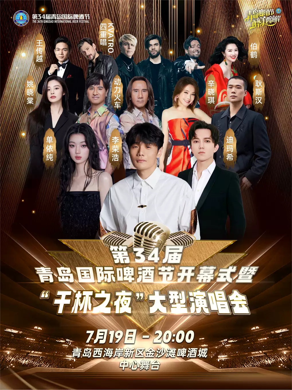 第34屆青島國際啤酒節(jié)開幕式暨“干杯之夜”大型演唱會,7月19日周五 20:00,青島西海岸新區(qū)金沙灘啤酒城,門票180元-1380元。